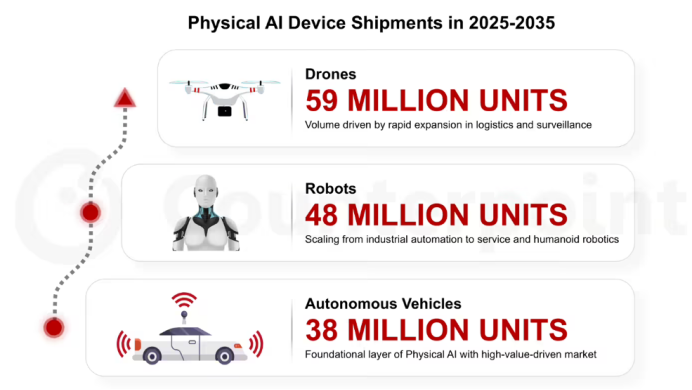 根据CounterpointResearch本月发布的最新物理AI设备预测,2025-2035这十年间其累计出货量将达到1.45亿台,其中无人机占到5900万、机器人为4800万、自动驾驶汽车则贡献3...